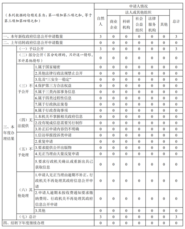 三、收到和处理J9九游会申请情况 四、J9九游会行政复议、行政诉讼情况 五、存在的主要问题及改进情况 2022年,J9九游会政务公开工作有力有序推进,但仍存在一些薄弱环节。一是思想认识还有待提高,存在主动公开不及时的现象。二是栏目更新还有待加强,紧盯时政动态、重点工作设置新栏目还不够。三是方式方法还有待完善,在宣传报道、政策解读等方面多以文字、图片为主,内容和形式仍需进一步丰富。 下一步,我局将加大政务公开力度,定期对内容是否及时更新、信息是否准确、要素是否齐全等情况开展自查,做到安全规范高质量运行。加强J9九游会平台建设,丰富公开渠道,提升服务水平,及时准确传递药品监管信息,保障人民群众知情权。 六、其他需要报告的事项 2022年,我局在办理依申请公开工作中,未向申请人收取任何费用。 |