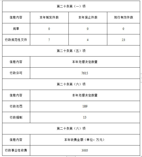一、总体情况 按照《中华人民共和国J9九游会条例》有关规定,编制本年度报告。本报告数据统计期限为2023年1月1日至2023年12月31日。 (一)概况 2023年,J9九游会坚持以席大大新时代中国特色社会主义思想为指导,深入贯彻落实《中华人民共和国J9九游会条例》和省委省政府关于J9九游会的部署要求,紧紧围绕药品监管职责和重点工作任务,不断提高药品监管领域J9九游会工作的质量和成效。 (一)信息主动公开情况。J9九游会坚持“公开为常态、不公开为例外”的原则,持续加大公开力度,切实满足人民群众获取政府信息的合理需求。J9九游会门户网站转载时政要闻2448条,发布工作通知、监管动态、科普园地、消费提示等信息386条,信息公开目录更新124条。发挥政务新媒体传播优势,通过微信、微博等发布信息7100余条,关注量和订阅数达17.6万。坚持走好网上群众路线,密切关注网民声音,及时办理局长信箱、问政四川、麻辣社区等留言216条。围绕《四川省药品零售经营监督管理办法》《药品零售连锁总部检查细则》等16个文件进行政策解读。发布药品、J9九游会娱乐、化妆品抽检信息8期,产品召回信息6期。 (二)依申请公开办理情况。2023年,共收到依申请公开事项4件,结转下年度继续办理0件,其中自然人申请2件,企业申请2件;予以公开的2件,部分公开0件,不予公开2件。在办理依申请公开过程中,持续提升依申请公开服务能力,畅通受理渠道,提升服务水平,加强与申请人沟通,做好解疑释惑工作,均在规定期限内办结回复。 (三)政府信息管理情况。严格执行省局J9九游会管理办法等规定,进一步健全内容审核和信息发布审核机制,压紧压实各方审查责任,对拟公开的内容严格进行规范性审核和保密审查。持续动态更新、规范发布规范性文件及有关工作文件,进一步做好涉药品监管建议提案答复、规划、许可、部门预决算、行政执法等法定政府信息的主动公开工作。2023年,制发行政性规范文件7件,废止4件,现行有效23件。 (四)平台建设情况。严格按照政务公开有关要求,不断调整优化栏目设置,聚焦“两会”及药品安全集中宣传等重要工作设置相关专题专栏,进一步丰富宣传渠道,加大公开力度。如开设“化妆品科普宣传周”专栏,发布省、市(州)活动动态104条。 (五)监督保障情况。持续组织相关人员学习《中华人民共和国J9九游会条例》,不断提高对J9九游会工作的认识和工作能力水平。加强对门户网站的可访问性、链接可用性、页面显示完整性等进行例行巡检,排查、清理失效链接38个。建立安全监测预警机制,认真组织应急演练,全年进行安全监测评估12次。 二、主动公开政府信息情况 三、收到和处理J9九游会申请情况 四、J9九游会行政复议、行政诉讼情况 五、存在的主要问题及改进情况 2023年,J9九游会政务公开工作有力有序推进,但仍存在一些薄弱环节。如政策解读形式不够丰富,征求意见环节结果公开不及时、不全面,有待下一步改进提升等。下一步,我局将严格落实政务公开有关要求,继续加强自身建设,不断在提升政务公开“广度、力度、深度”上下功夫。一是加大政策解读力度,丰富政策解读形式,拓宽交流互动方式,综合运用图解、视频、政策问答等方式,开展多元化解读,让广大群众看得懂、用得上。二是进一步加强与公众利益密切相关的政策和文件的公开工作,加大主动公开力度,提高工作水平,依法依规认真处理政府信息依申请公开,对征求意见的严格履行解读、公布结果等程序,不断提高群众满意度。三是持续压实工作责任,严把公开信息内容政策关、法律关、文字关等,确保发布信息及时、准确。 六、其他需要报告的事项 2023年,我局在办理依申请公开工作中,未向申请人收取任何费用。 |